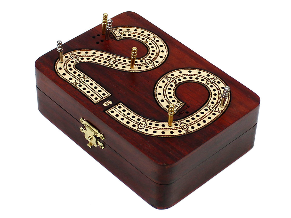 One can't find such gorgeous handmade cribbage board from any other source as this has been developed by our designing and research section with immense dedication. This kind of unique cribbage board with 6 metal pegs and folding box for card storage is being offered for the first time and is hardly available elsewhere.