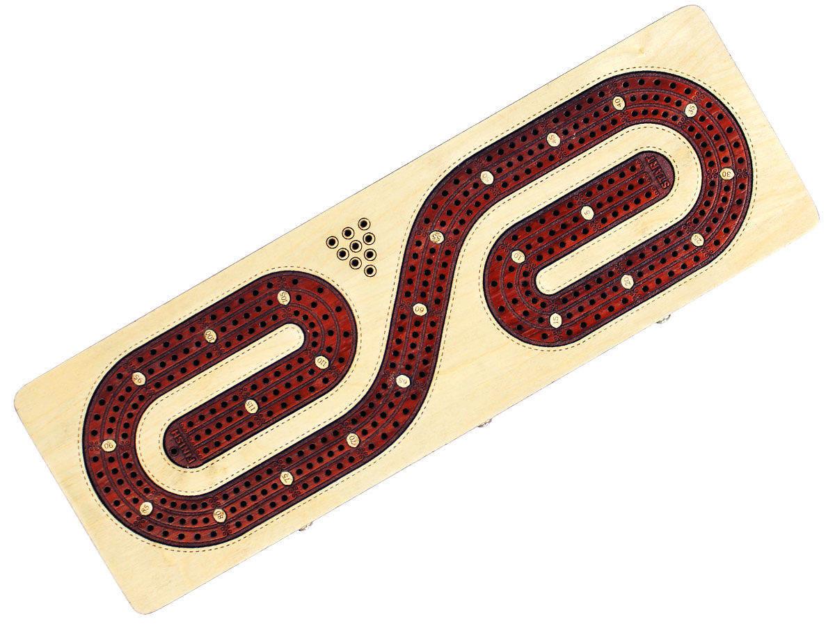 Cribbage Board Store presents exquisite 3 track (120 Points) Alphabet S Shape Continuous Cribbage Board in Flat Version with Drawer Storage. The handmade cribbage board is made of Maple and through special inlay process, S Shape bloodwood tracks are inlaid on the board with great precision. The Board has 3 Front Pull Drawers - 2 Drawers are used to store Playing Cards and 1 Small Drawer for storing Pegs.