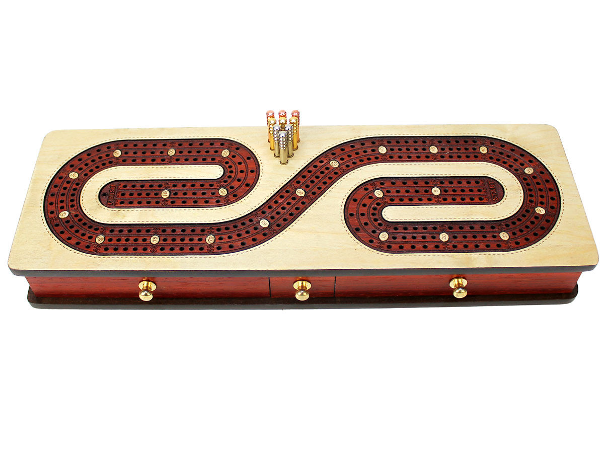 Continuous Cribbage Board inlaid with Maple/Bloodwood : Alphabet S Shape Inlaid 3 Tracks with Drawer Storage