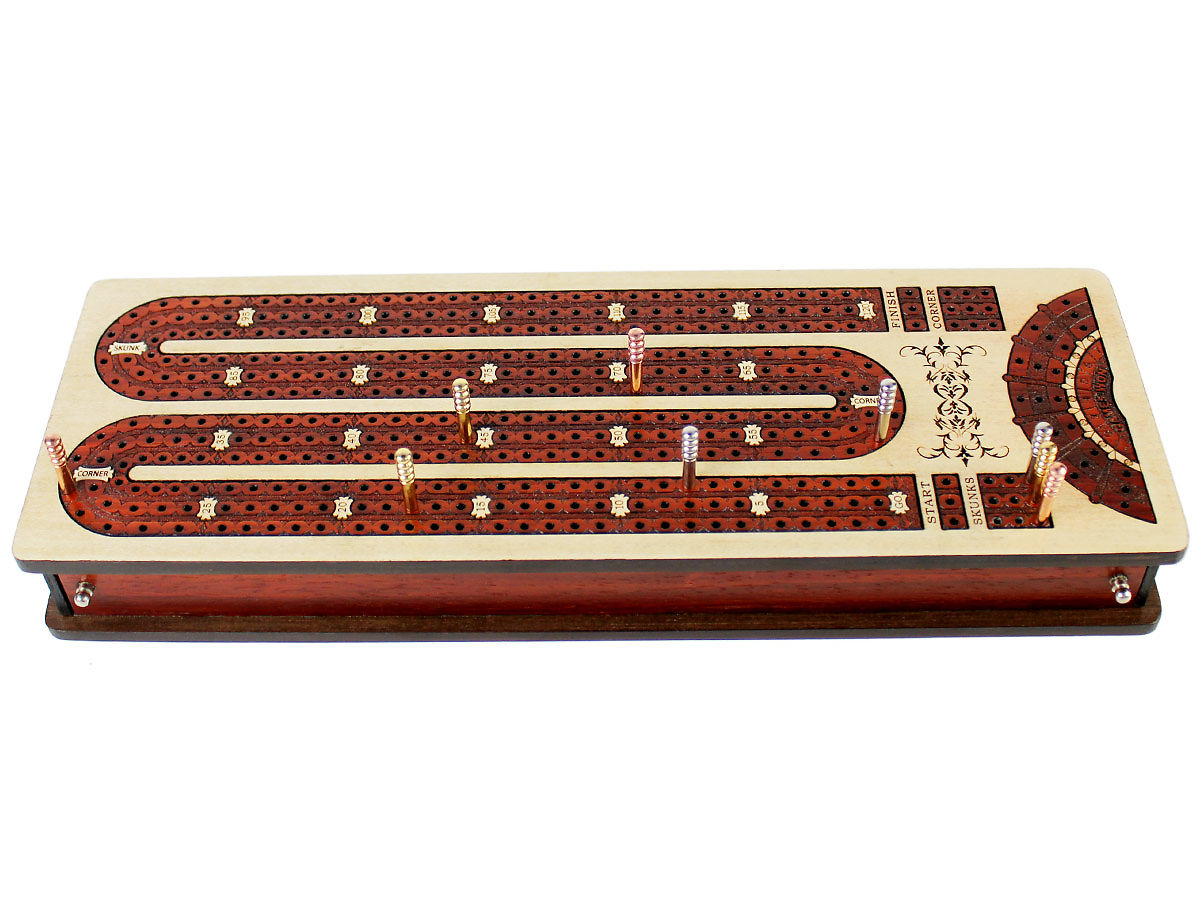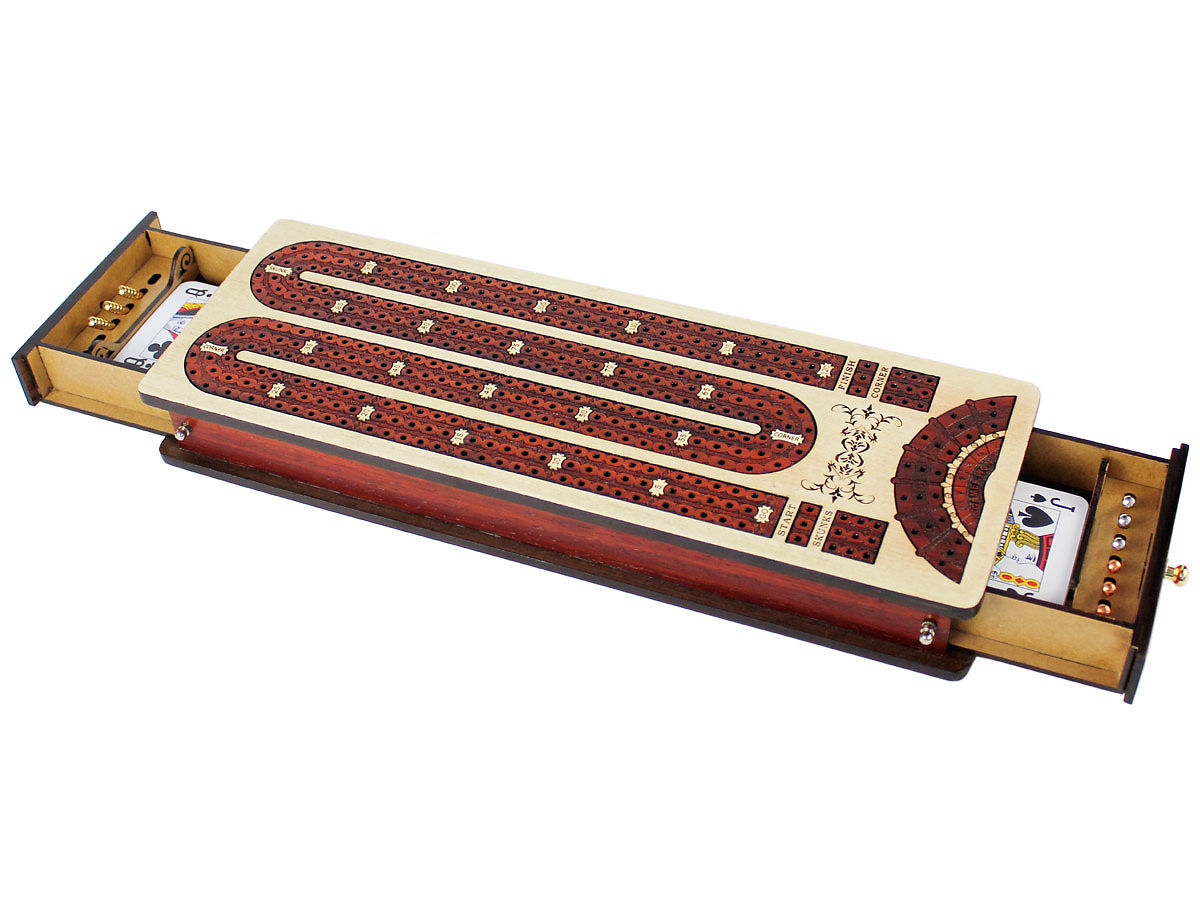 Continuous Cribbage Board Maple / Bloodwood and Side Drawers : 3 Tracks with place to mark won games