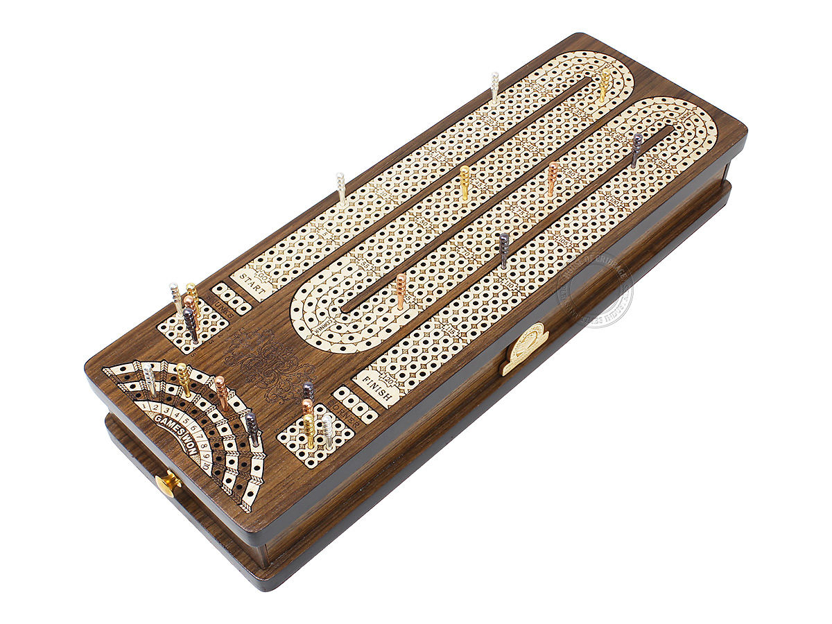 One can't find such gorgeous handmade continuous cribbage board from any other source as this has been developed by our designing and research section with immense dedication. This kind of unique cribbage board with 20 metal pegs and drawers to store cards is being offered for the first time and is hardly available elsewhere.