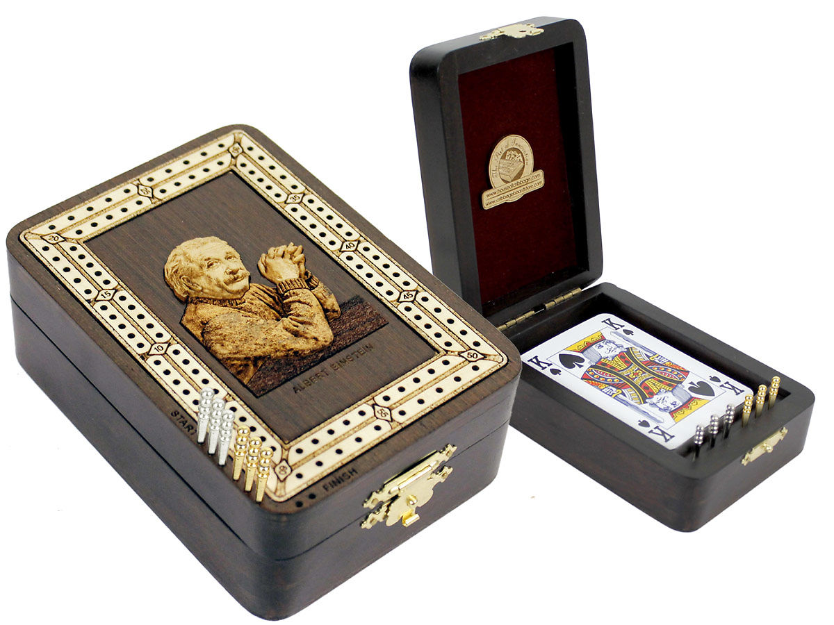 Cribbage Board Store presents exquisite 2 tracks (60 Points) 2 Dimensional (2D) Wooden Carved Einstein image inlaid on Cribbage Board & Box in Folding version. The handmade cribbage board/box is made of Wenge Wood and through special inlay process, Maple tracks are inlaid on the board with great precision.