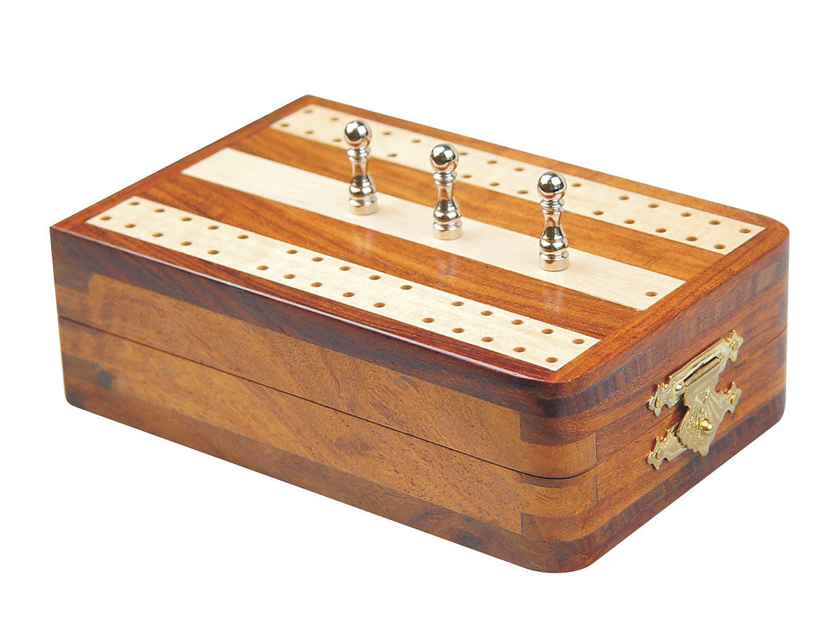 Cribbage Board Store presents exquisite 2 track (60 Points) Regular Design Regalia Cribbage Board & Box in Folding version. The handmade folding travel cribbage board/box is made of Golden Rosewood and through special inlay process, white maple tracks are inlaid on the board with great precision.