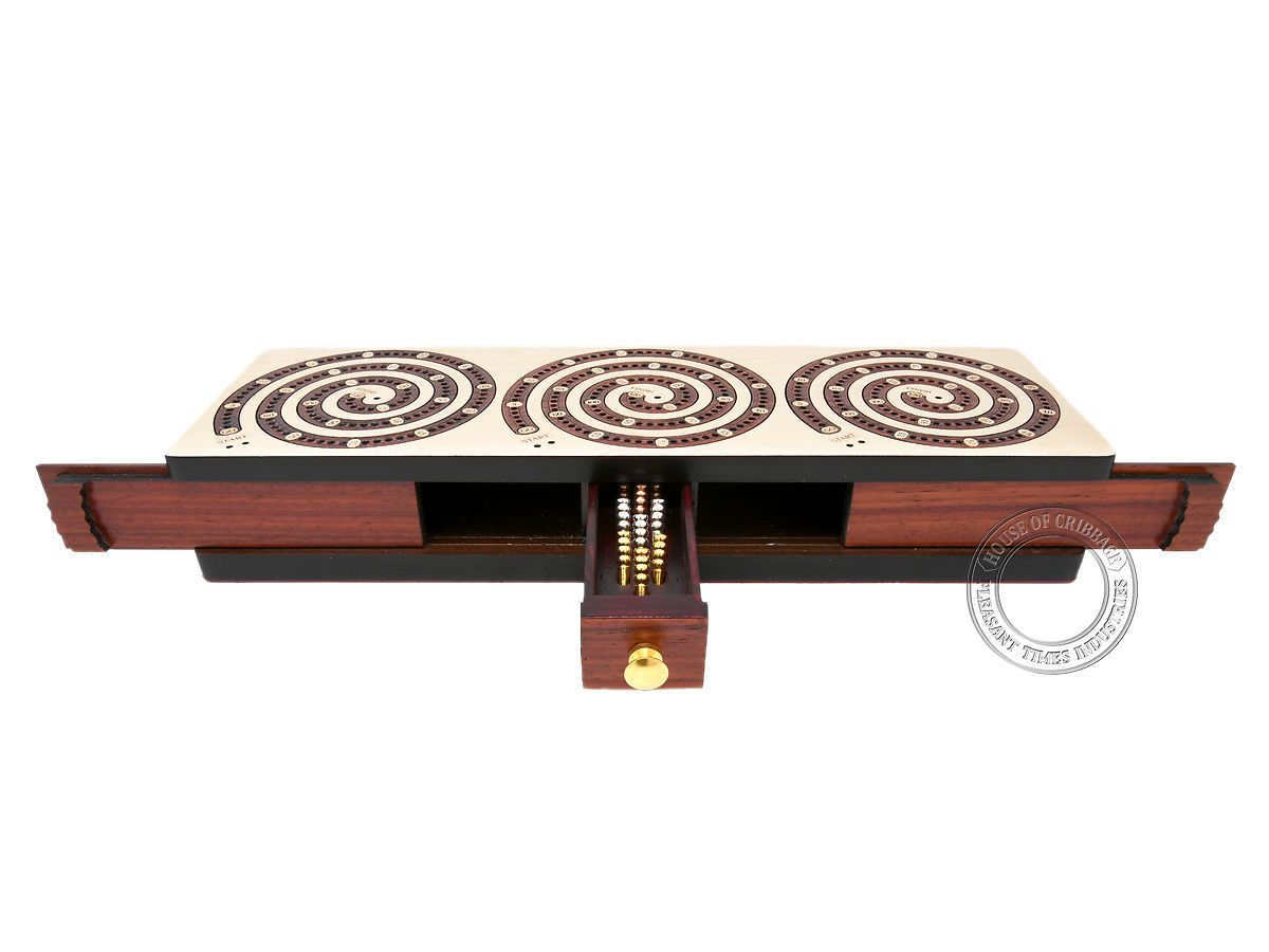 Spiral Design Continuous Cribbage Board / Box inlaid in Maple Wood / Bloodwood - 3 Track - Separate Storage Space for Two Deck of Cards & Pegs