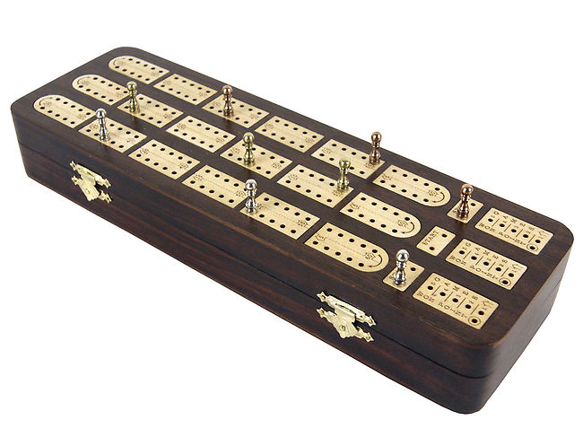 One can't find such gorgeous handmade continuous cribbage board from any other source as this has been developed by our designing and research section with immense dedication. This kind of unique cribbage board with 9 metal pegs and box to store cards is being offered for the first time and is hardly available elsewhere.