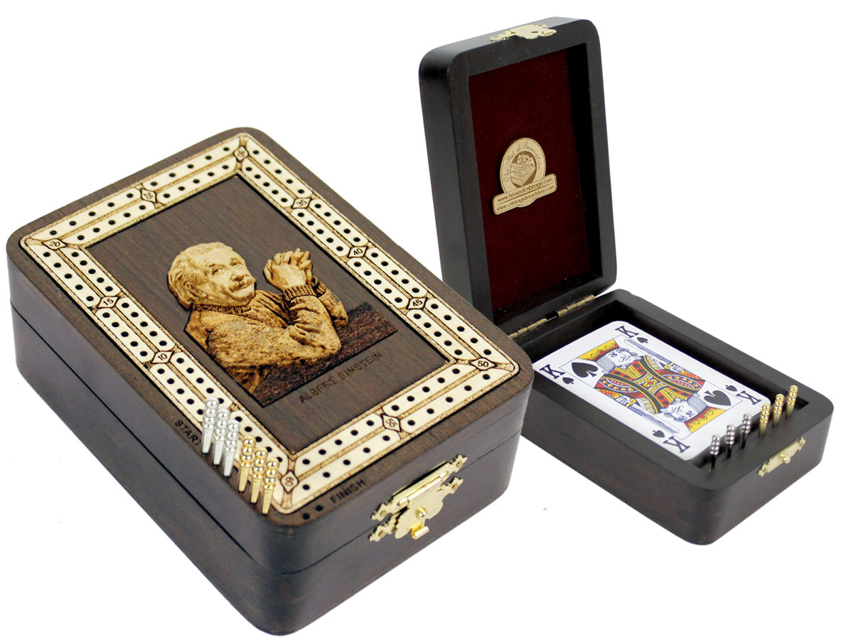 Einstein Wood Carved Inlaid Folding Cribbage Board / Box Wenge Wood / Maple - 2 Tracks