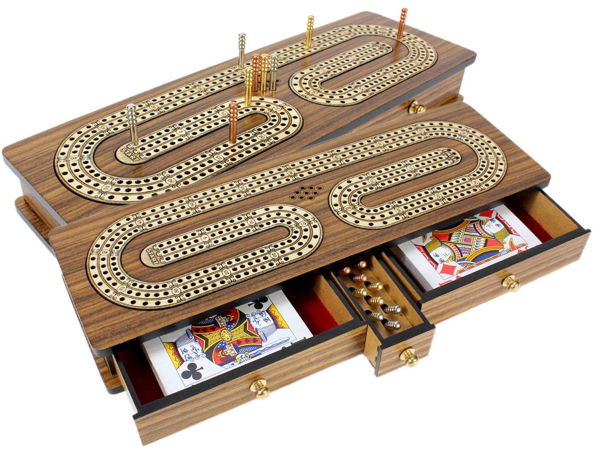Continuous Cribbage Board Teak Wood / Maple and Side Drawers : 4 Tracks with skunks, corners and place to mark won games